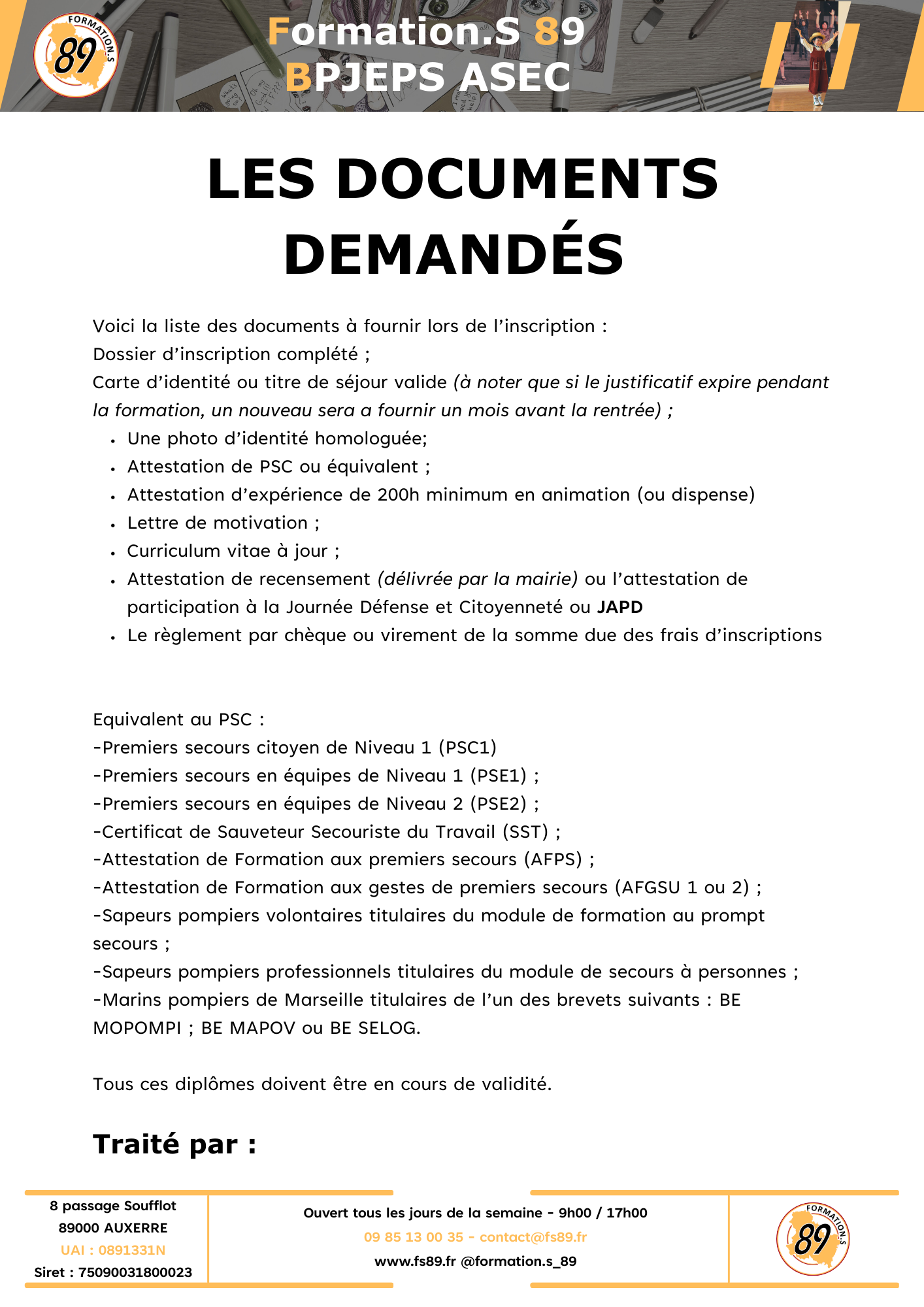 - Etre titulaire de l’une des attestations de formation relatives au secourisme (AFPS, PSC, PSC, STT …)